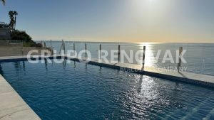 Finalmente, la planta primera copada por una gran estancia salón comedor cocina de casi 50 metros cuadrados con unas preciosas vistas al jardín, al porche y una inmensa piscina infinita con una lámina de agua de 35 metros cuadrados sobre el Mediterráneo.